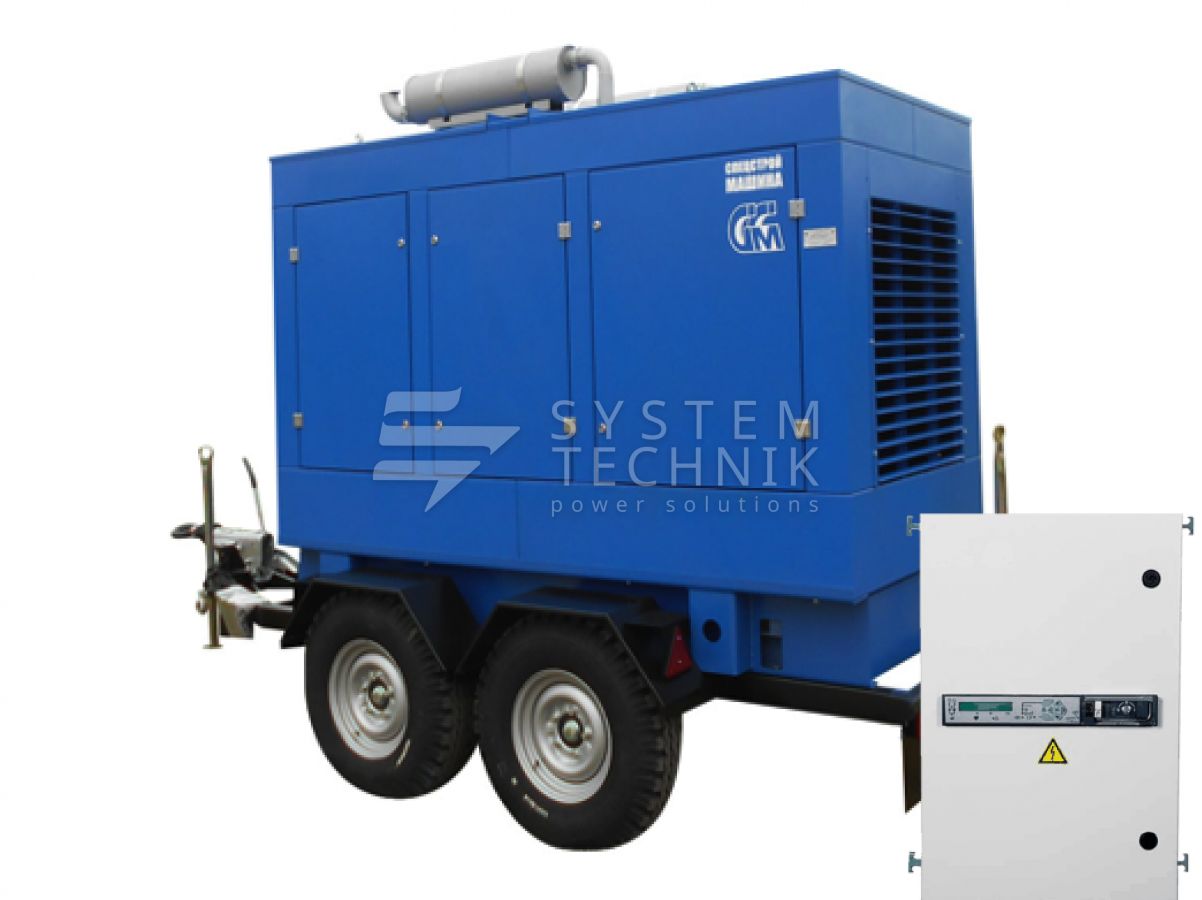 - ССМ ЭД-60-Т400-2РПМ2 (Marelli) в погодозащитном кожухе на шасси с АВР на прицепе